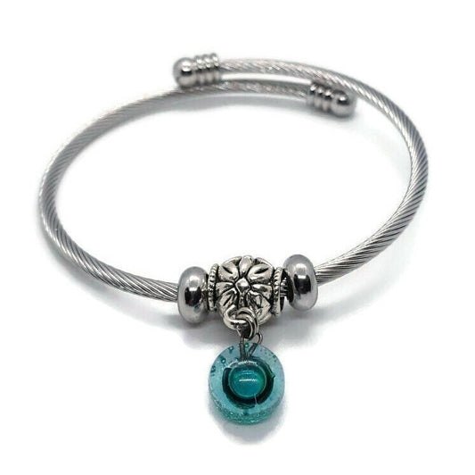 Green and Blue glass bead Stainless Steel Bracelet Glass Charm Bead. Easy to put on adjustable stretch memory wire. One size fits most