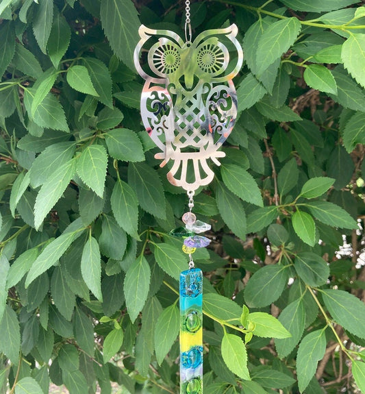 Owl hanging decoration. Hand made fused glass ornament. Colorful home decor.