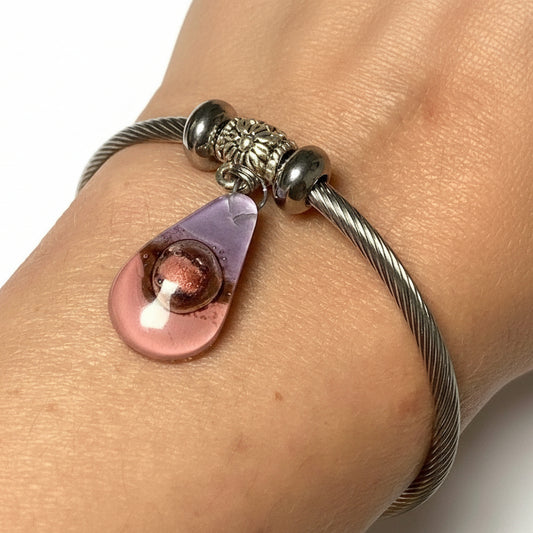 Pink, Copper and Brown Stainless Steel Bracelet Glass Charm Bead. Easy to put on adjustable stretch memory wire. One size fits most