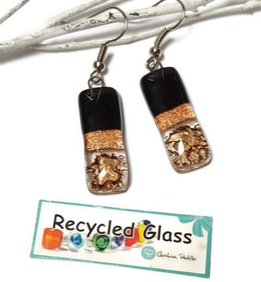 Small bar rectangle Dangle Earrings Recycled Glass. Fused drop Glass. Black, copper anf brown drop earrings.