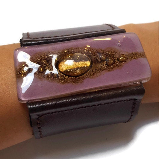 Stylish Wide Leather Cuff. Chocolate dark brown color Leather Bracelet. Recycled glass Bracelet. Lavender, brown w golden bubbles