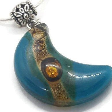Teal and brown moon shape pendant. recycled Fused glass Necklace