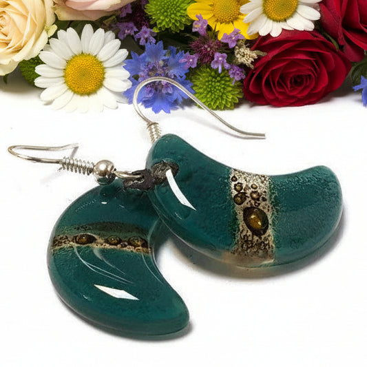 Teal and Brown Moon Earrings Recycled Glass Drop Earrings. Glass Jewelry
