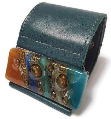 Wide Leather cuff . Glass and leather. Turquoise glass with Purple Leather Cuff. Glass wide bracelet