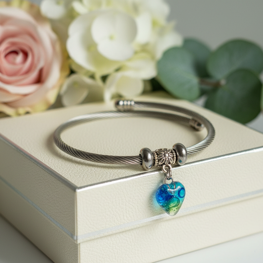 Green and Blue glass bead Stainless Steel Bracelet Glass Charm Bead. Easy to put on adjustable stretch memory wire. One size fits most