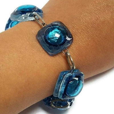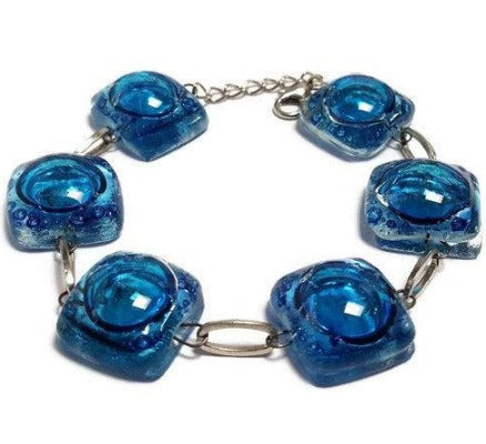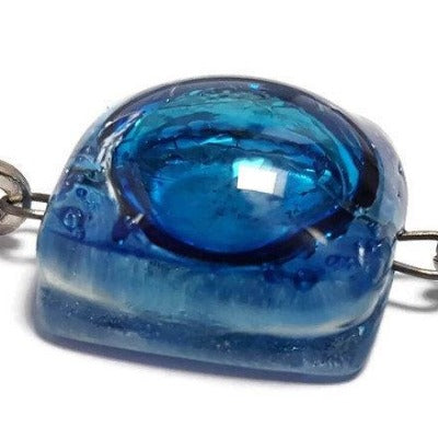 Made of recycled glass that is cut, painted and fired in a kiln to fuse. Each bead is one of a kind. Love bubbles!