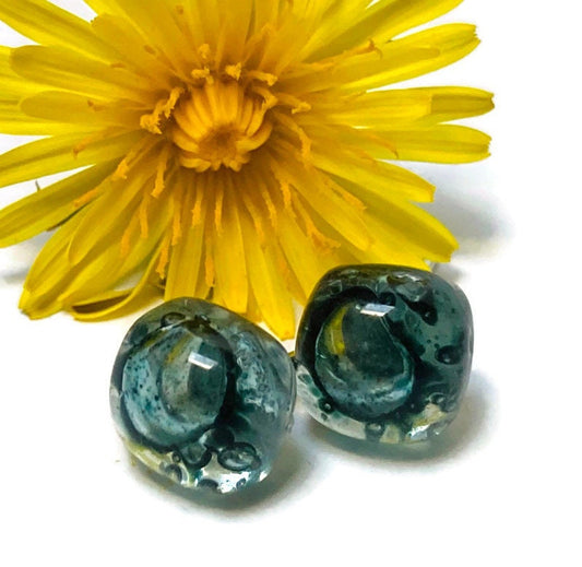 Small square post Earrings. Clear blue green with gray shades color. Fused Glass Studs. Recycled Glass jewelry. Stud earrings