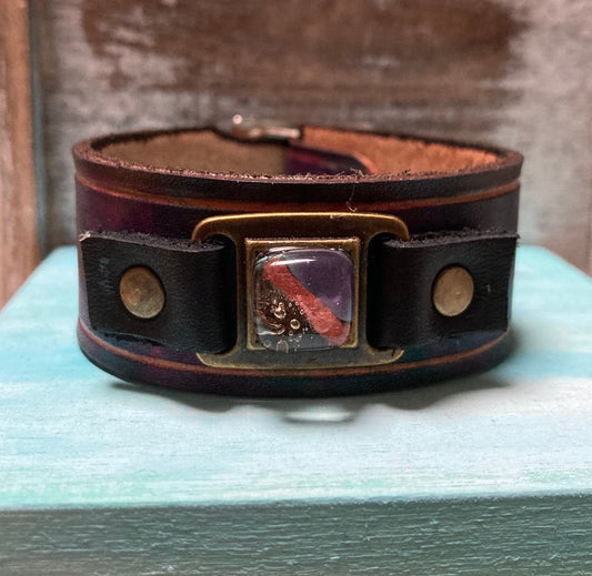 Handmade dyed color leather cuff. Recycled fused glass bracelet. Hand painted natural leather.