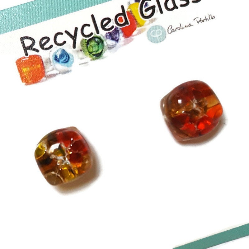 Mosaic made Recycled seed beads. Multicolor. Recycled glass post earrings. Lots of reds, oranges and yellows. Awesome.