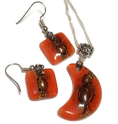 Set earrings and Moon pendant. Red and brown Recycled Glass. Handmade