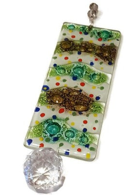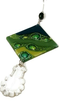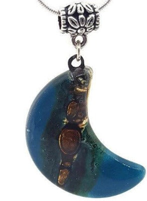 Teal and brown moon shape pendant. recycled Fused glass Necklace
