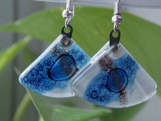 Fan Shaped White Blue and a purply color Recycled Glass Drop Earrings. Dangle Earrings