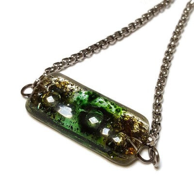 Minimalist, Dainty, Pull Tie bracelet. Adjustable slider bracelet with recycled glass charm. Stainless Steel. Organic brown green color.