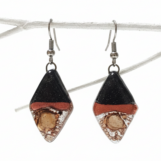 Fused glass Dangle Earrings. Black, copper and Brown Diamond Shaped Earrings. Recycled Glass Drop Earrings, long earrings.