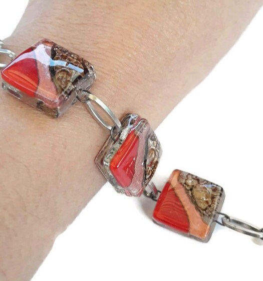 Recycled Fused Glass Red, Copper and Brown Bracelet