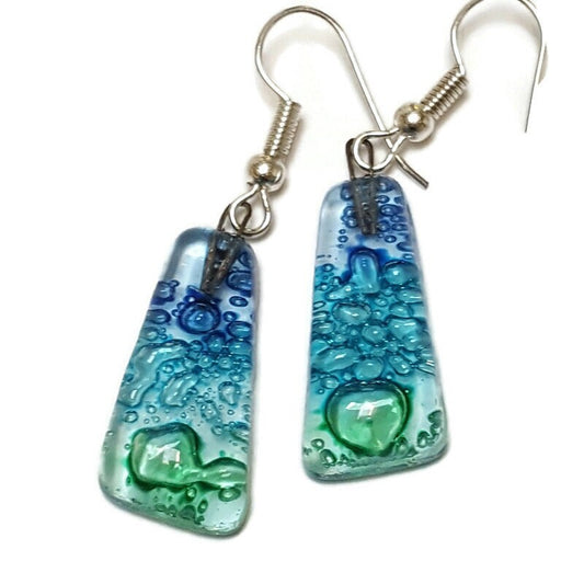 Small bar rectangle Dangle Earrings Recycled Glass. Fused drop Glass blue drop dangle earrings.