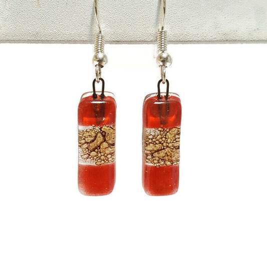 Small bar rectangle Dangle Earrings Recycled Glass. Fused drop Glass red and caramel brown color drop earrings.