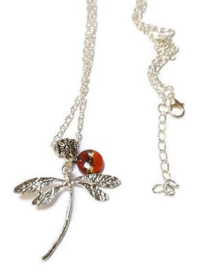 Dragonfly necklace. Recycled fused glass Red, orange and Brown bead.