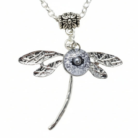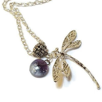 Dragonfly necklace. Recycled fused glass Purply bead.