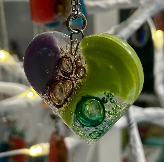 Green, lilac and brown Heart shape Recycled Fused Glass Necklace limited edition. Heart pendant