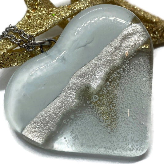 White and clear white Heart shape Recycled Fused Glass Necklace limited edition. Heart pendant