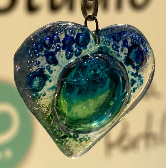 Blue Turquoise and green Heart shape Recycled Fused Glass Necklace limited edition. Heart pendant