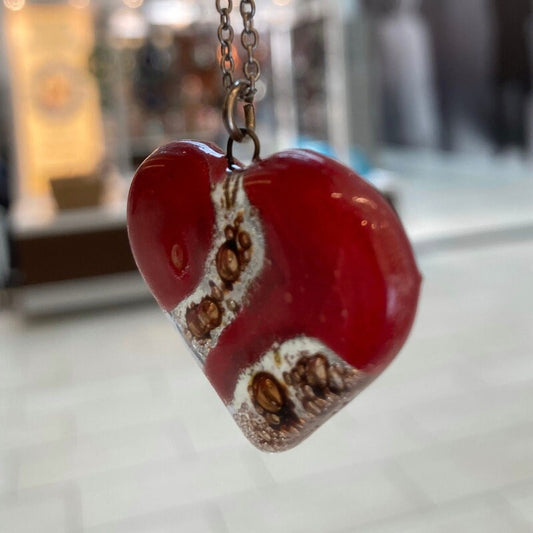 Red and caramel brown Heart shape Recycled Fused Glass Necklace limited edition. Heart pendant