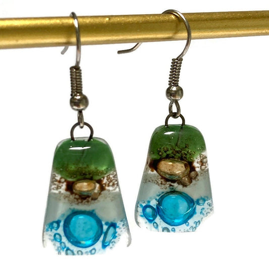 Green, Brown, white and Turquoise Recycled Fused Glass dangle Earring. Drop Earrings. Glass Art