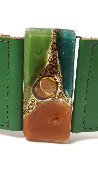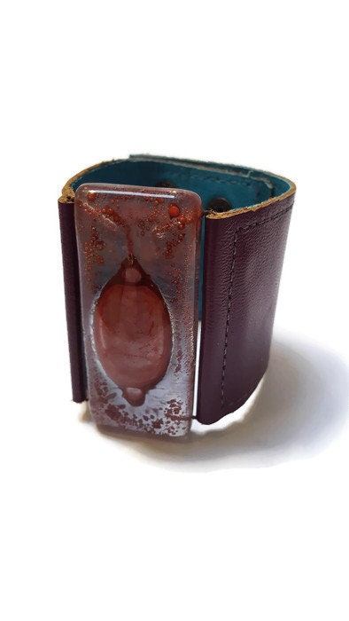 Handmade dyed color leather cuff. Recycled fused glass bracelet. Hand painted natural leather.
