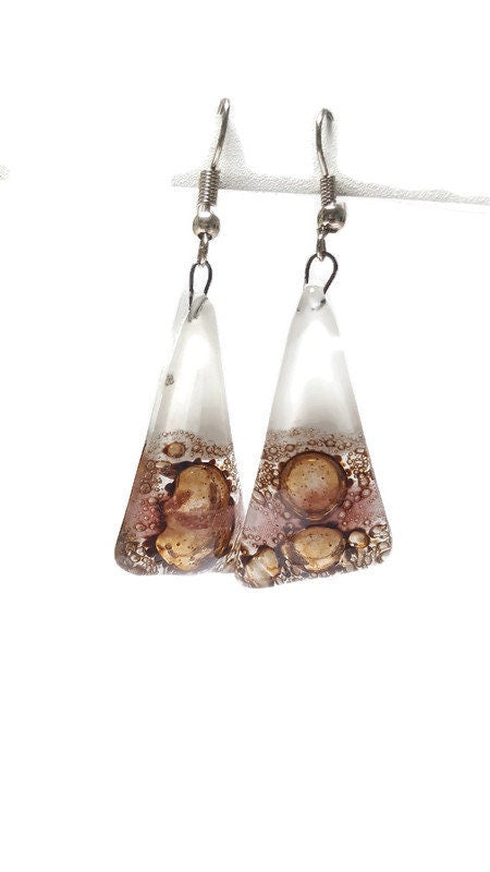 Long Triangle Drop drop Earrings. White, pink and Brown Recycled Fused Glass dangle earrings