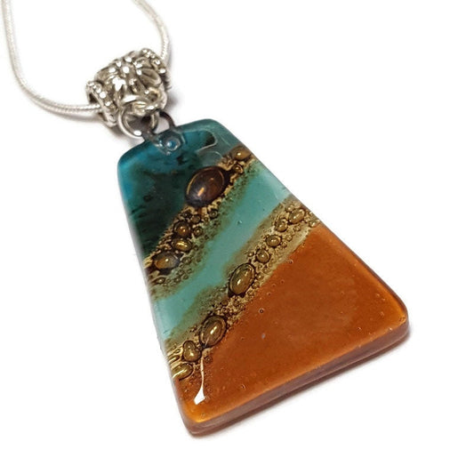 Terracota and teal Fused Glass small Pendant. Recycled Glass Necklace. Awesome glass bubbles. Earthy colors. Best handmade gift idea.