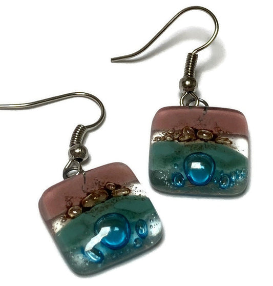 Pink, Turquoise, Brown and soft Teal and turquoise Square fused glass dangle earrings. Handmade recycled Glass beads. Drop Earrings