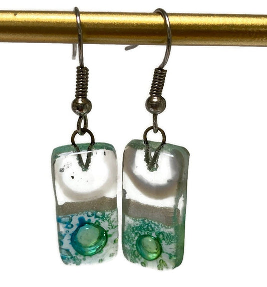 Clear and Green with pearly white details. Rectangle Dangle Earrings Recycled Glass. Fused drop Glass blue, brown and white drop earrings.