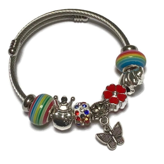 Rainbow, Red flower Stainless Expandable Easy to put on stretch memory wire Charm Bracelet. One size fits most