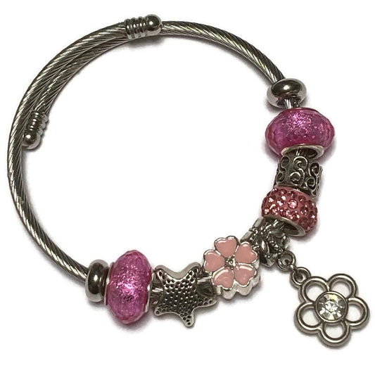 Flower. Pink Stainless Expandable Easy to put on stretch memory wire Charm Bracelet. One size fits most