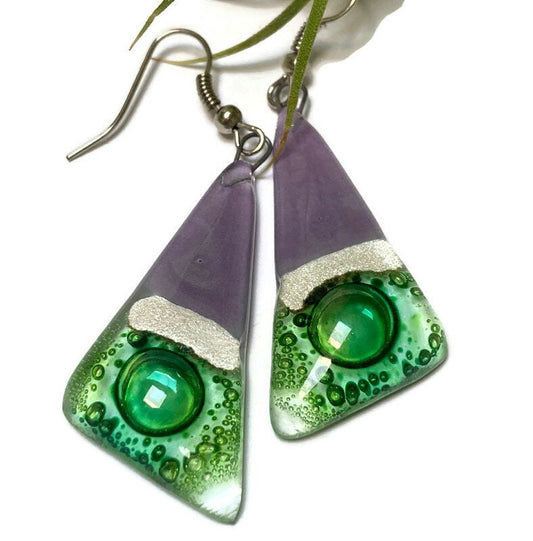 Long Triangle Drop drop Earrings. Green, Lilac and pearly white Recycled Fused Glass dangle earrings