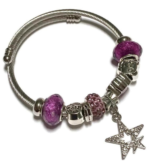 Purple Stainless Expandable Easy to put on stretch memory wire Charm Bracelet. One size fits most