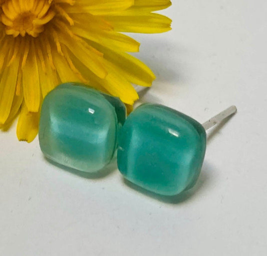 Small square post Earrings. Light teal green color. Fused Glass Studs. Recycled Glass jewelry. Stud earrings