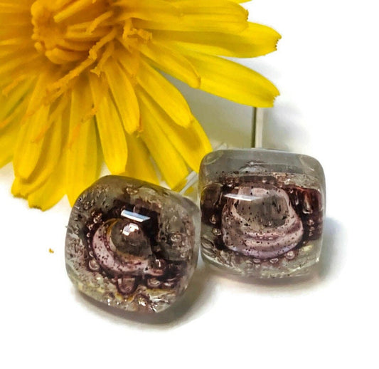 Small Post bubbly purple-brown Earrings. Fused Glass Studs. Recycled Glass jewelry. Stud earrings