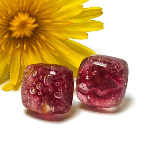 Small square post Earrings. Cranberry color. Fused Glass Studs. Recycled Glass jewelry. Stud earrings