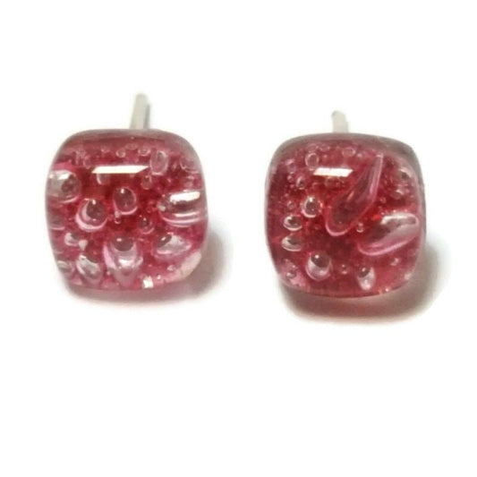 Small square post Earrings. Cranberry color. Fused Glass Studs. Recycled Glass jewelry. Stud earrings