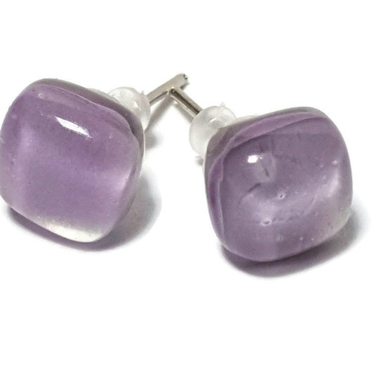 Small square post Earrings. Lilac lavender color. Fused Glass Studs. Recycled Glass jewelry. Stud earrings