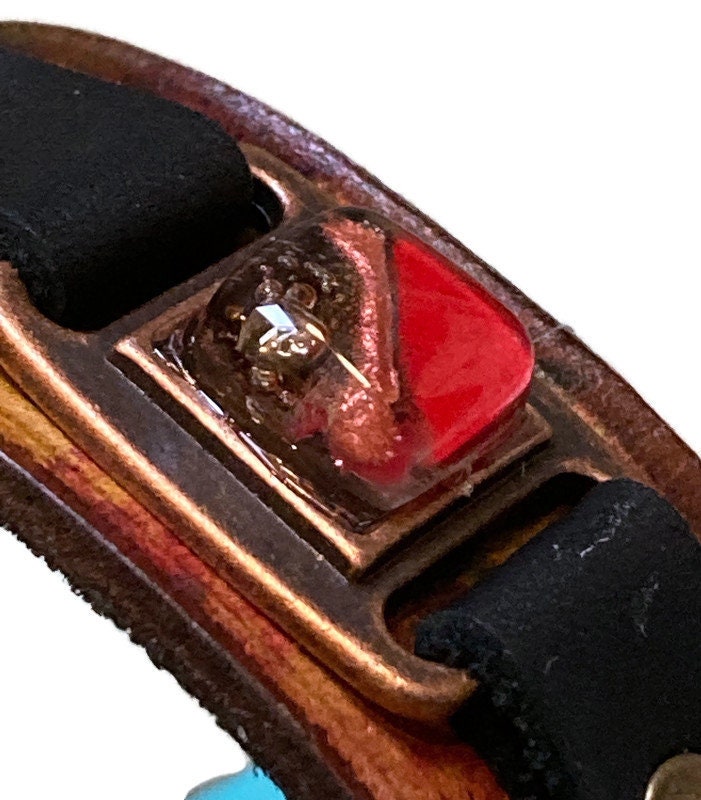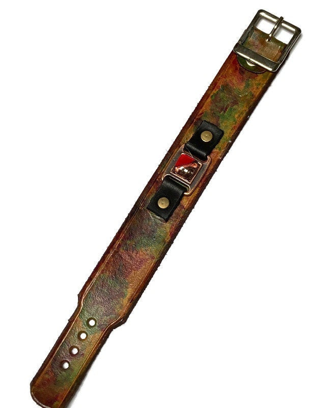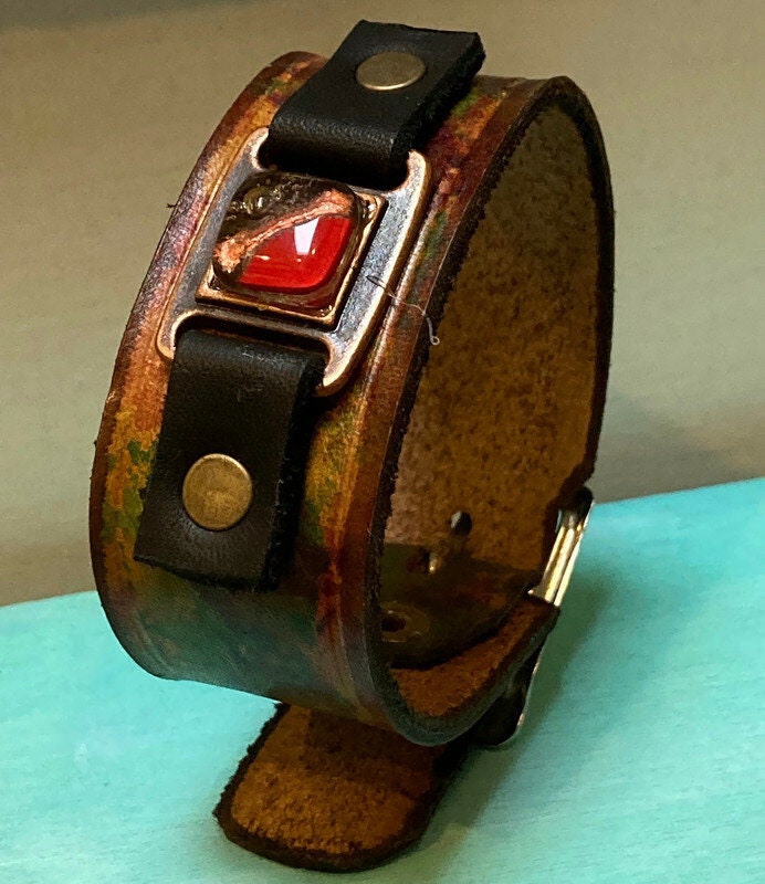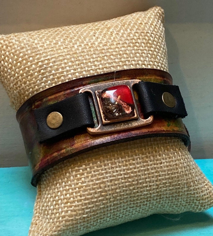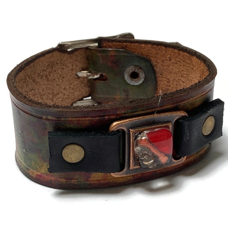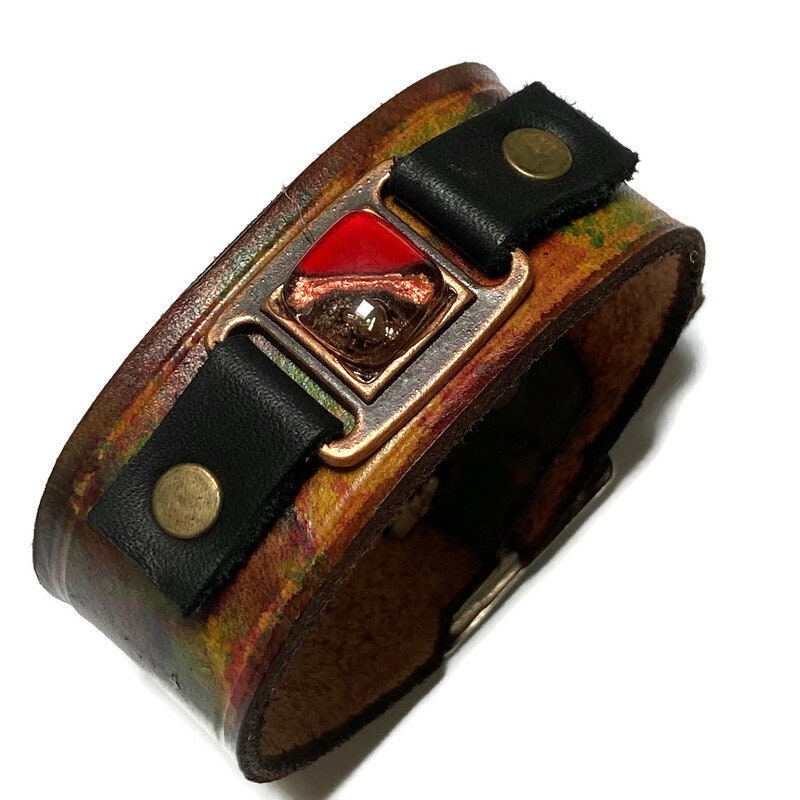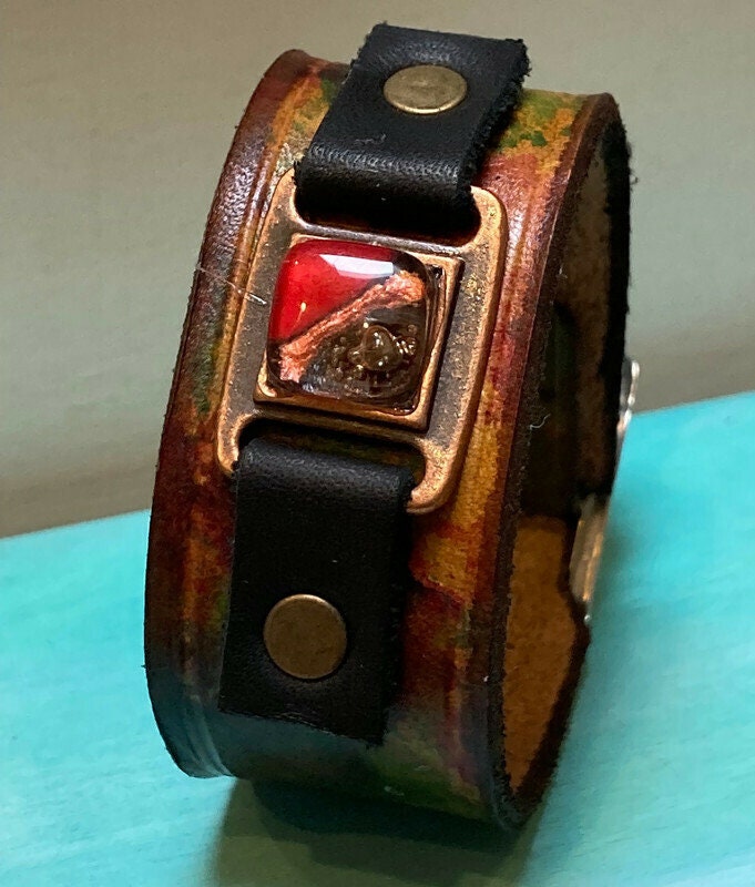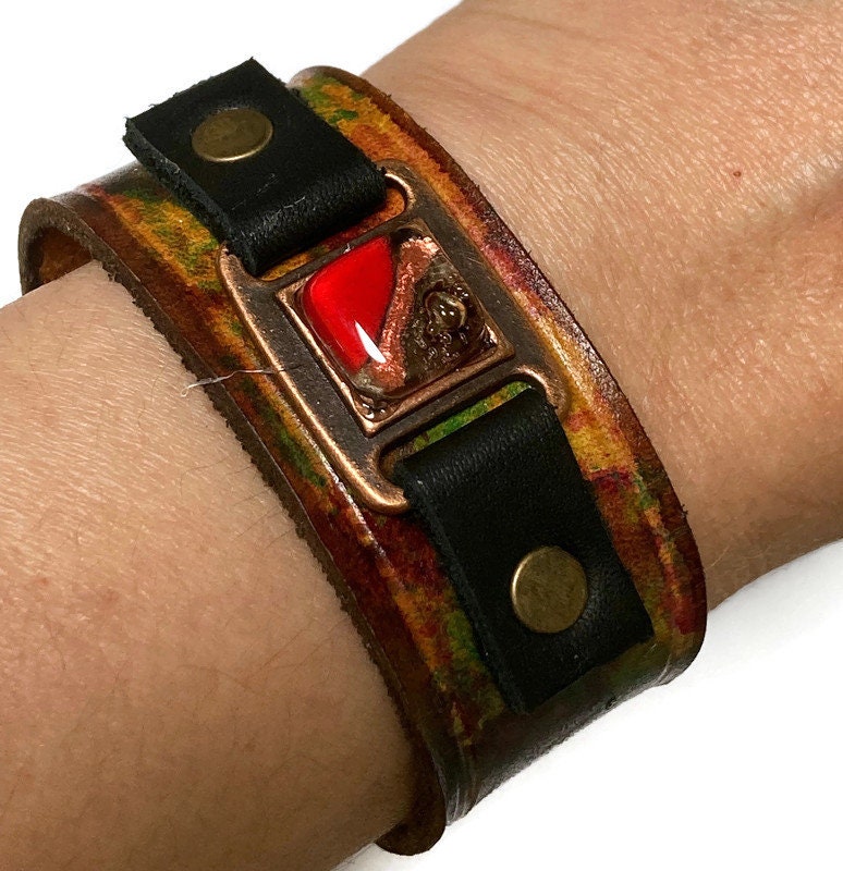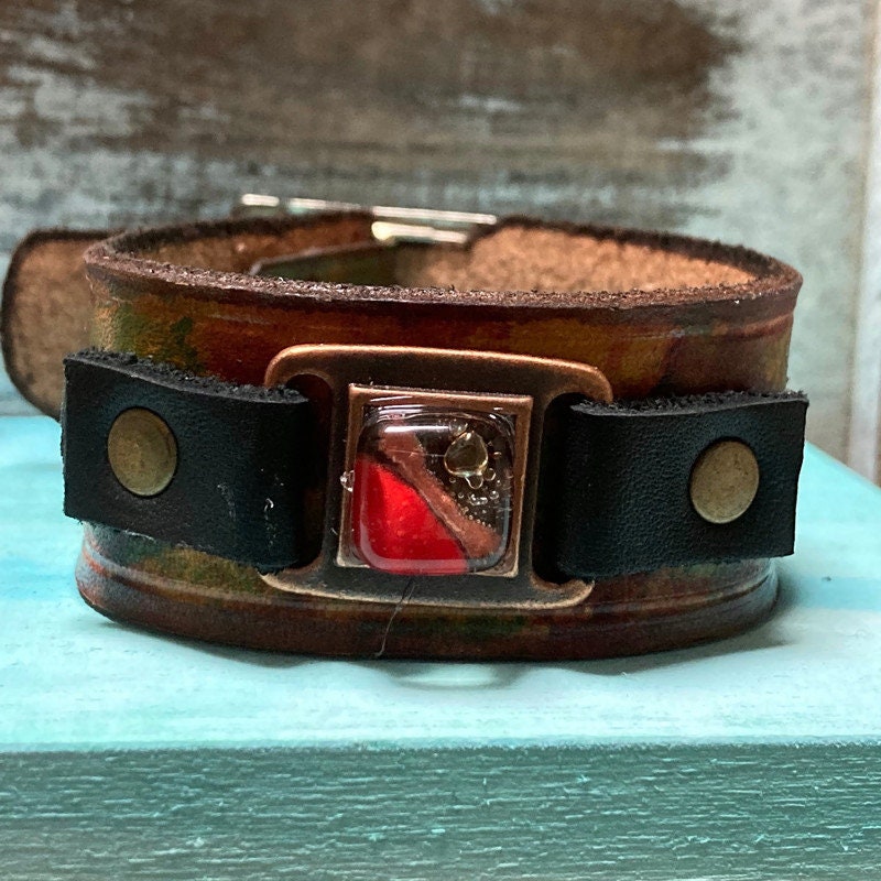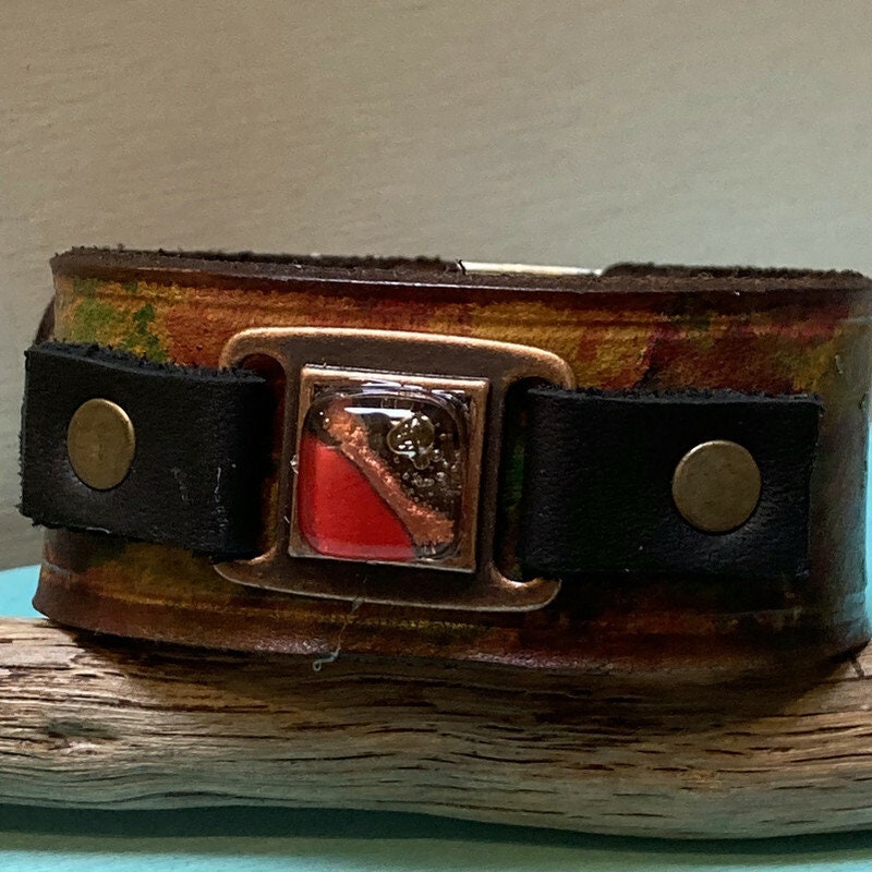 Hand dyed color leather cuff. Recycled fused glass bracelet. Hand painted natural leather.Red Brown and Red glass