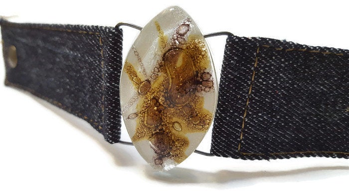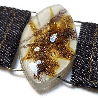 Denim Bracelet. White dark purple and Brown Fused Glass and reclaimed Denim Cuff.