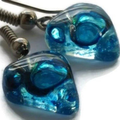 Small turquoise Earrings. Heart Shape Recycled glass Jewelry. Fused glass drop Earrings.