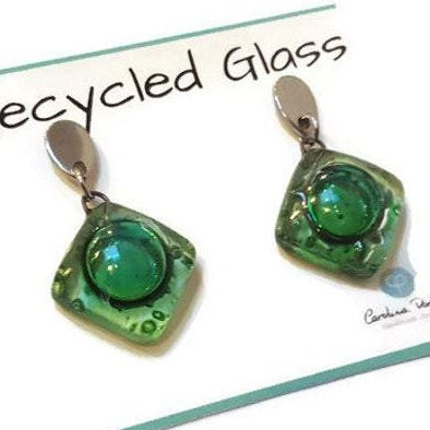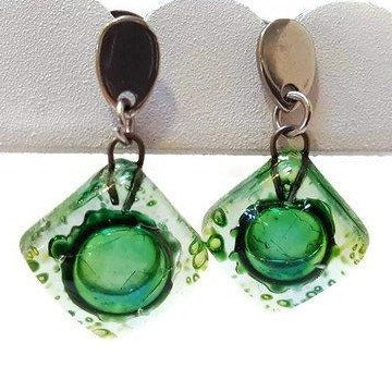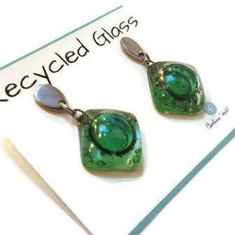 Small green recycled fused glass post dangle earrings. Drop earrings. Handmade Stud drop earrings