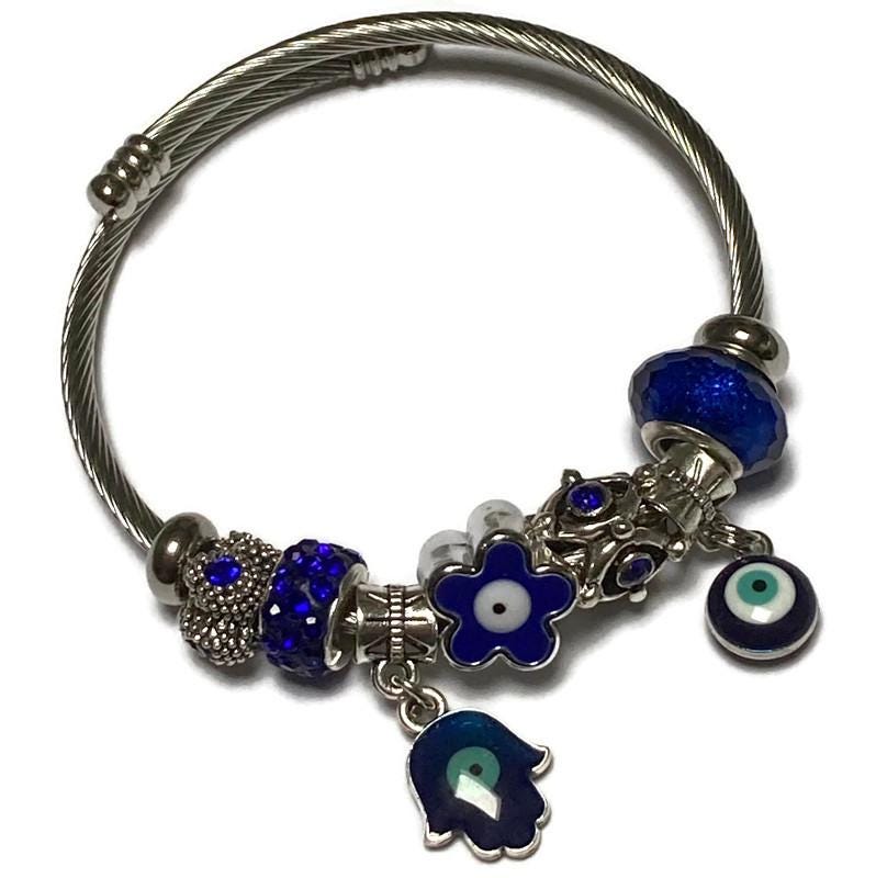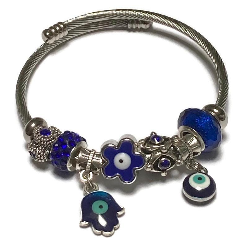Awesome Blue Evil eye Stainless Expandable Easy to put on stretch memory wire Charm Bracelet. One size fits most