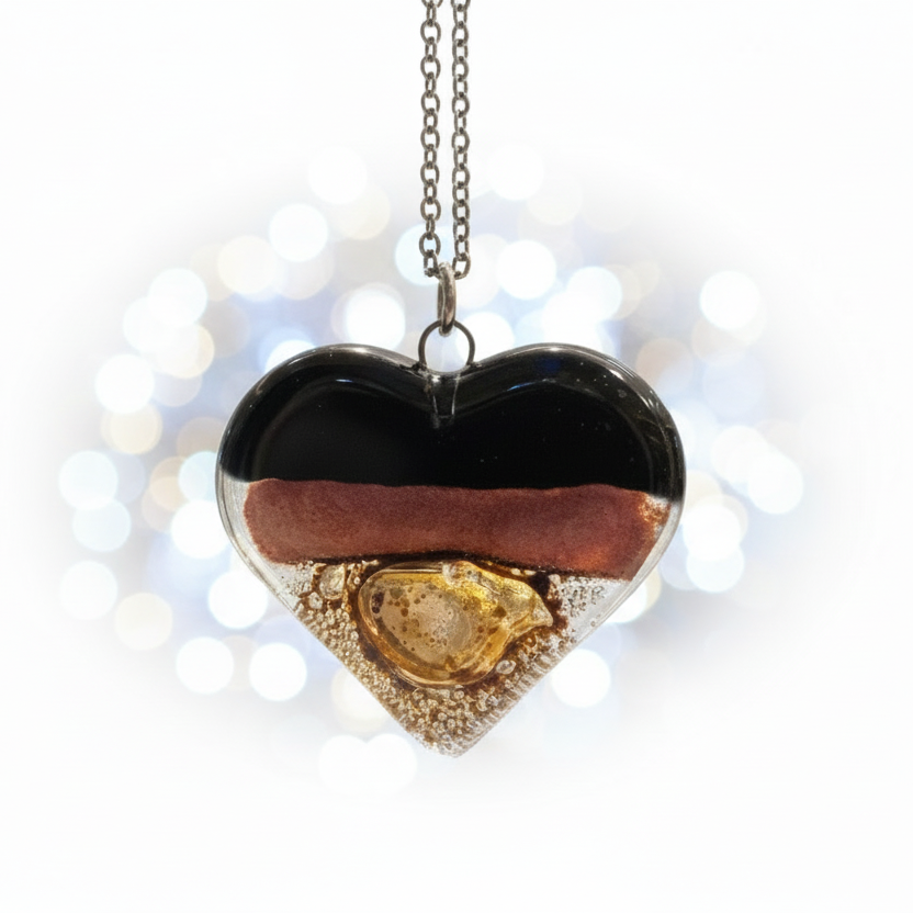 Black, copper and brown Heart shape Recycled Fused Glass Necklace limited edition. Heart pendant