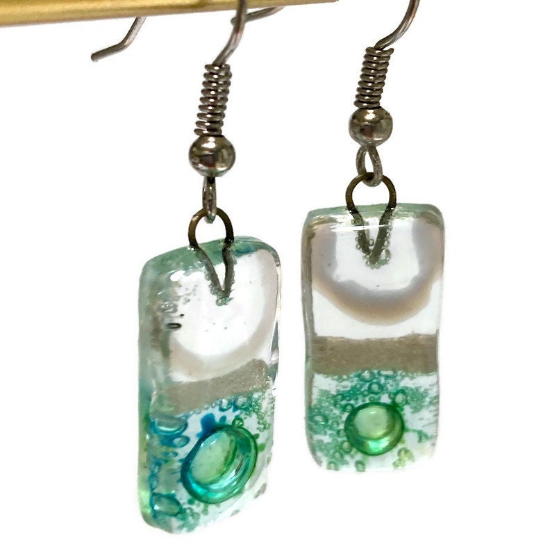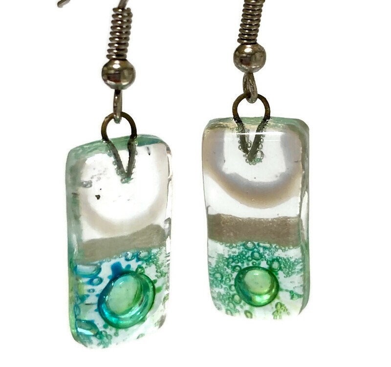 Clear and Green with pearly white details. Rectangle Dangle Earrings Recycled Glass. Fused drop Glass blue, brown and white drop earrings.