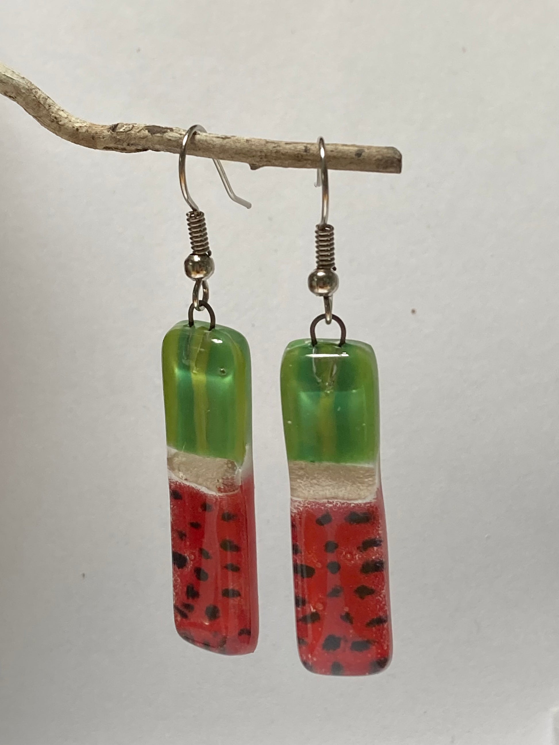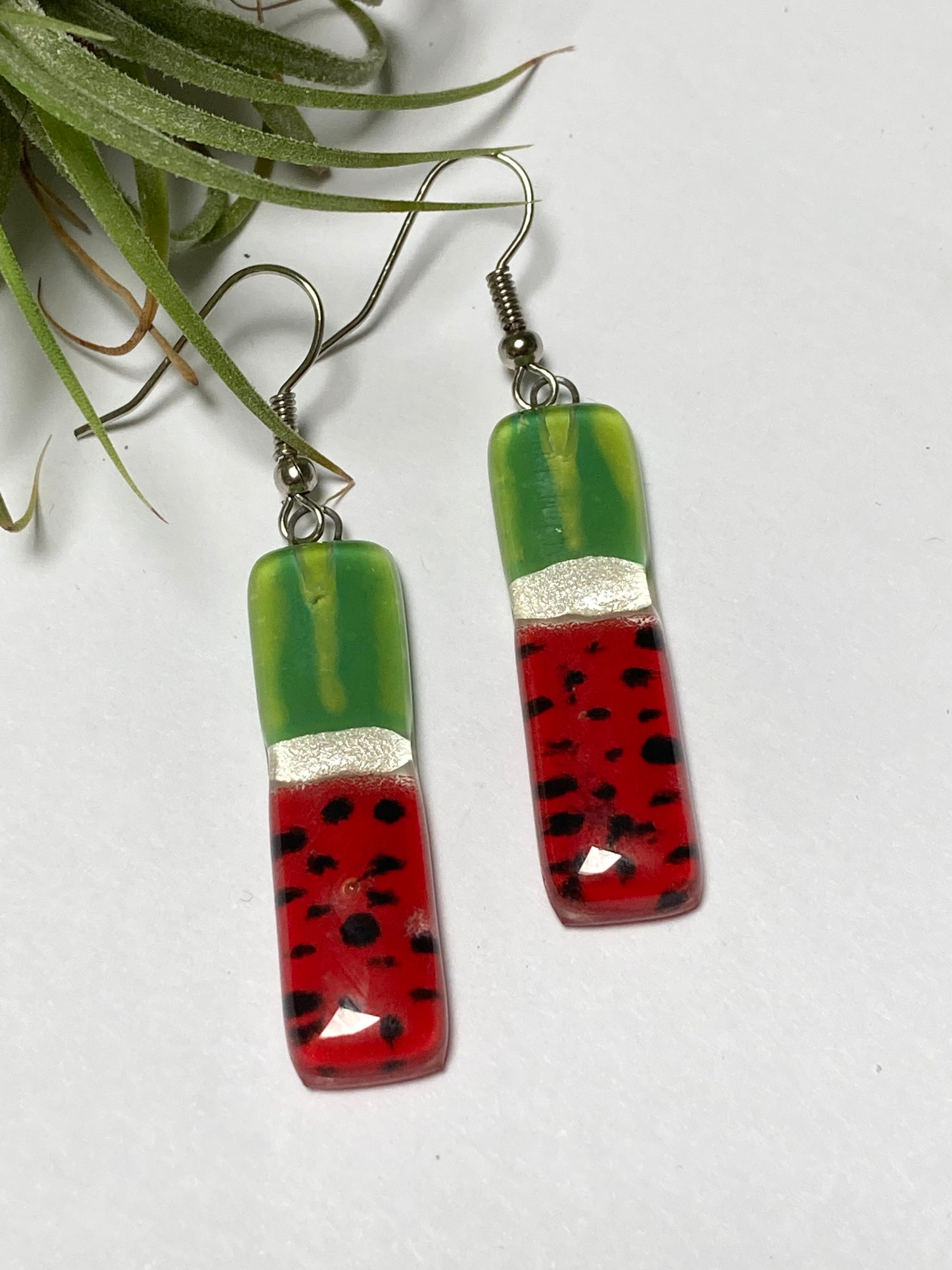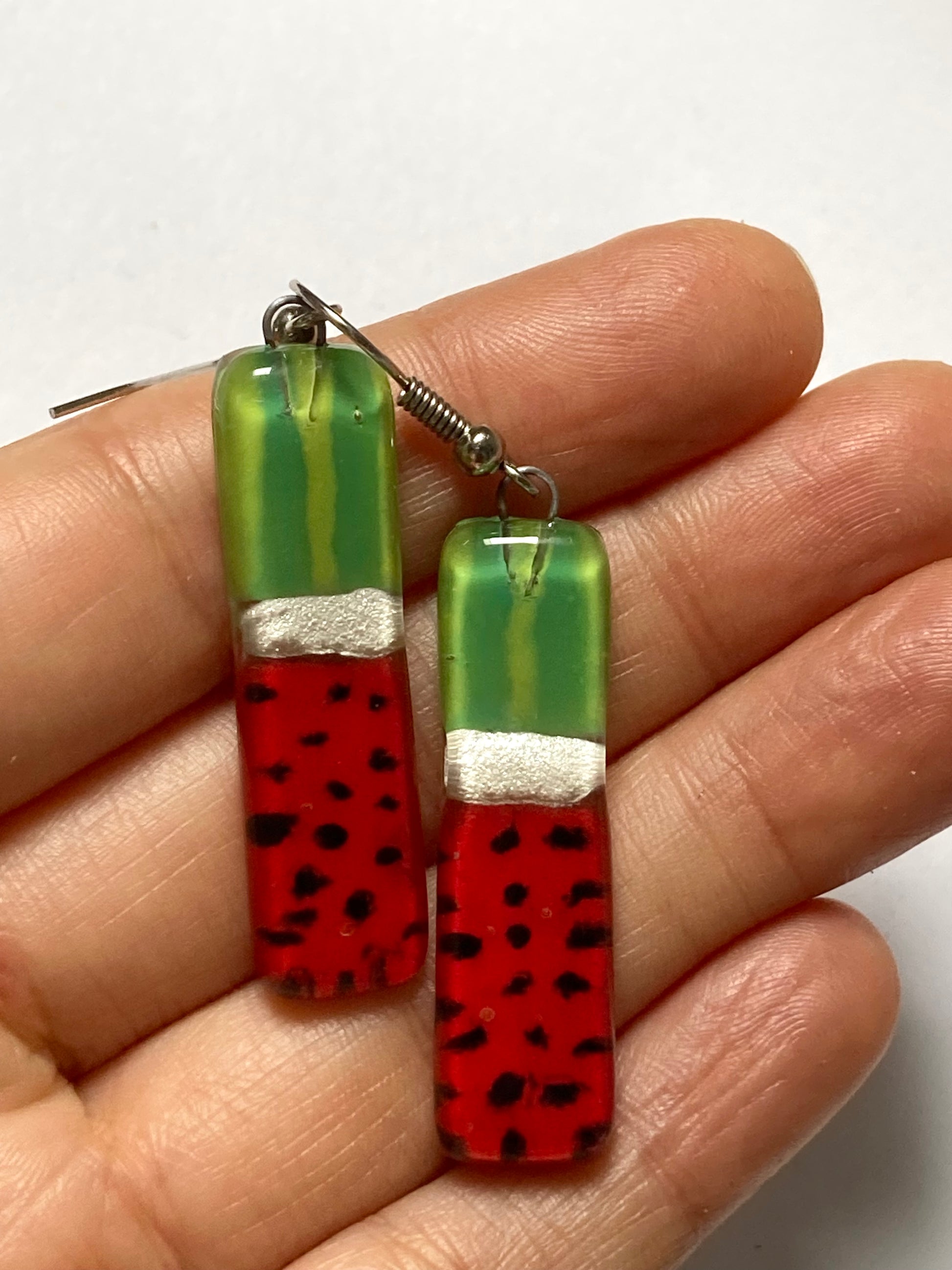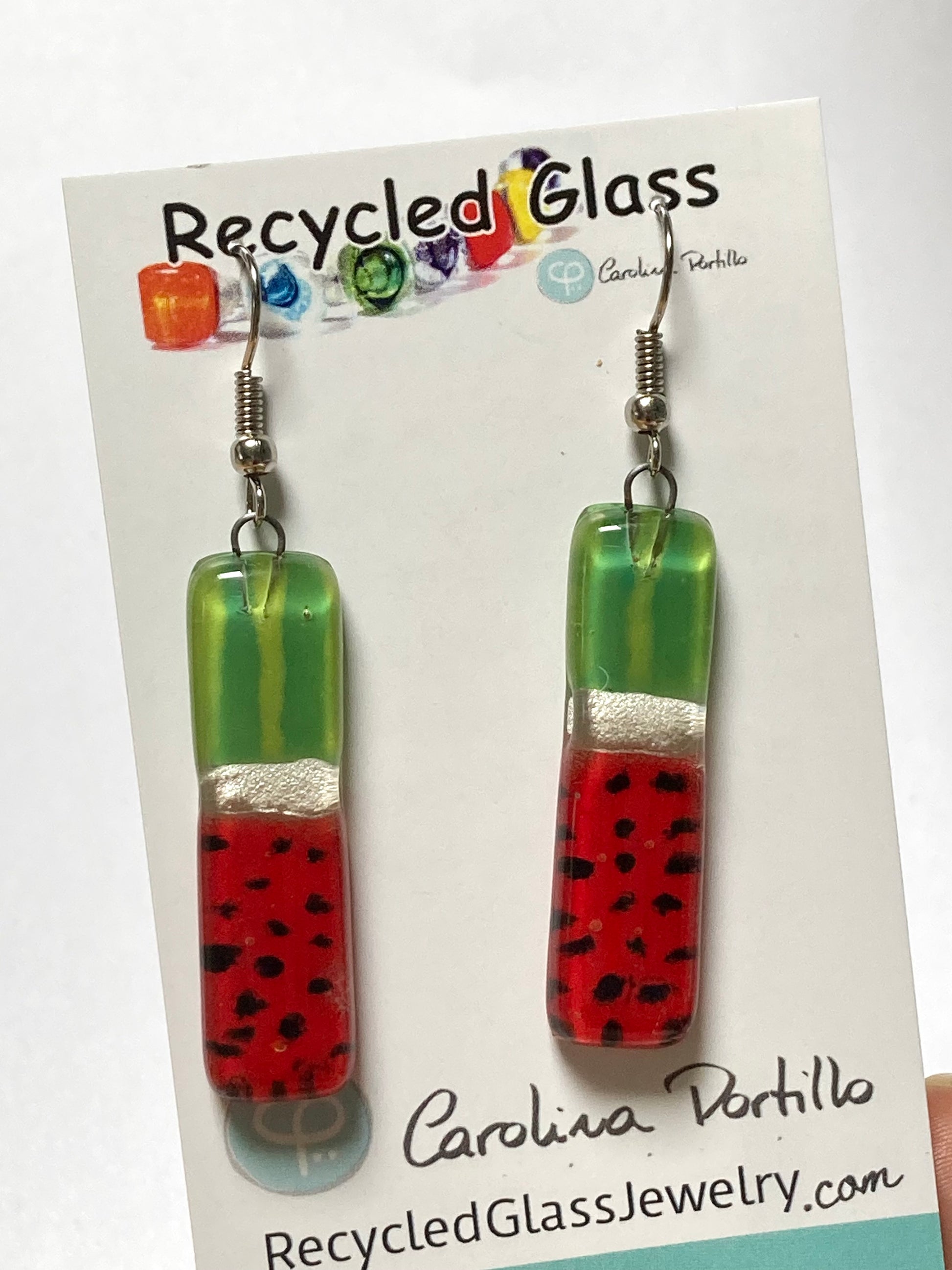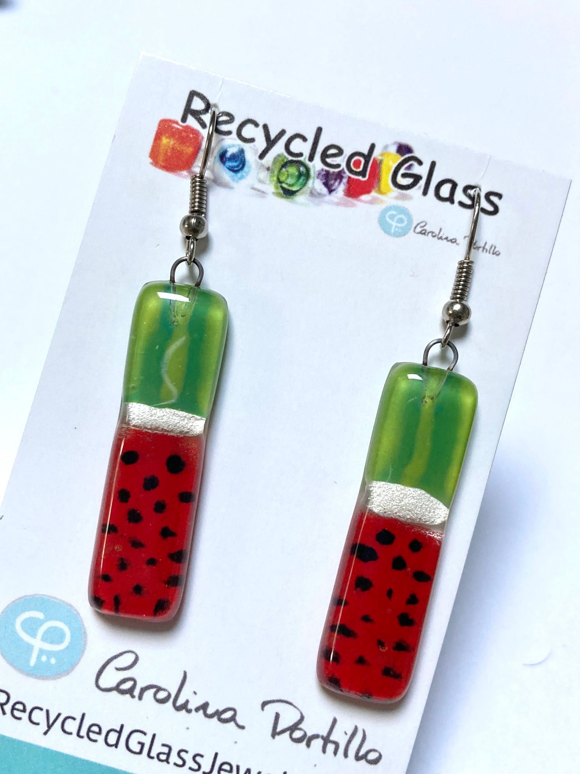 Long ‘Watermelon’ Recycled Fused Glass Dangling earrings
